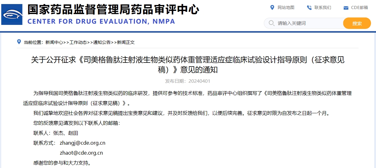 关于公开征求《司美格鲁肽注射液生物类似药体重管理适应症临床试验设计指导原则(征求意见稿)》意见的通知