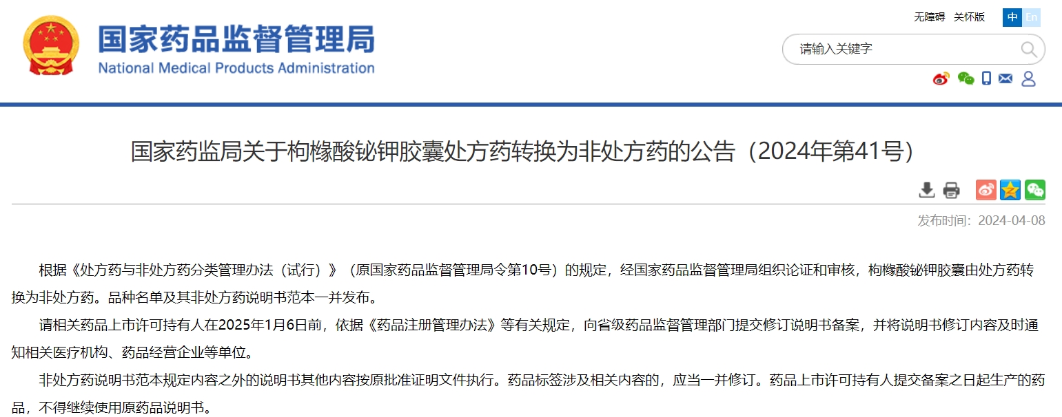 国家药监局关于枸橼酸铋钾胶囊处方药转换为非处方药的公告(2024年第41号)