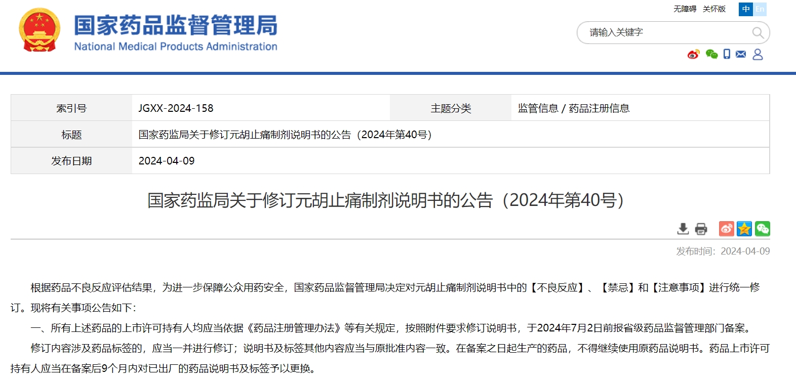 国家药监局关于修订元胡止痛制剂说明书的公告(2024年第40号)