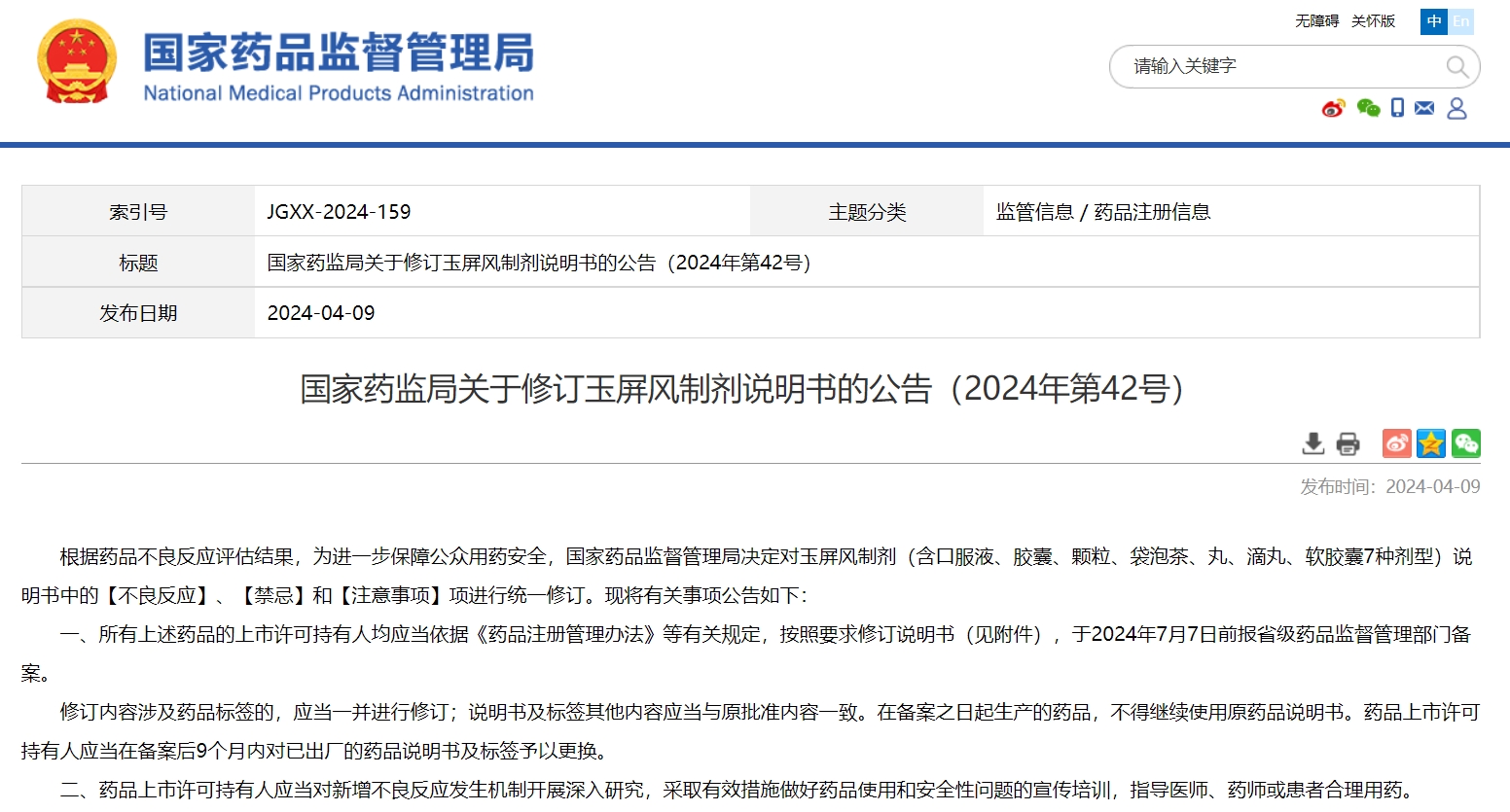 国家药监局关于修订玉屏风制剂说明书的公告(2024年第42号)