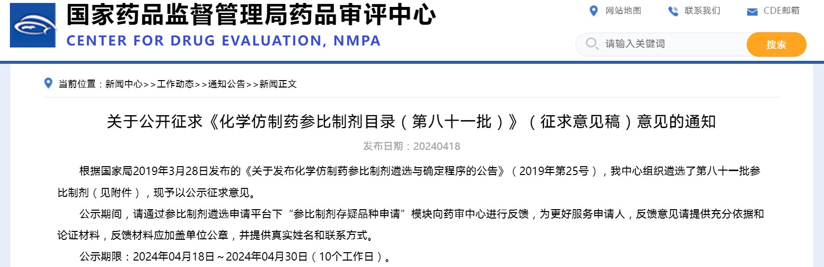 关于公开征求《化学仿制药参比制剂目录(第八十一批)》(征求意见稿)意见的通知