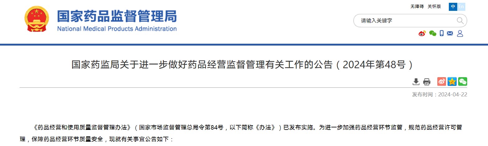 国家药监局关于进一步做好药品经营监督管理有关工作的公告(2024年第48号)