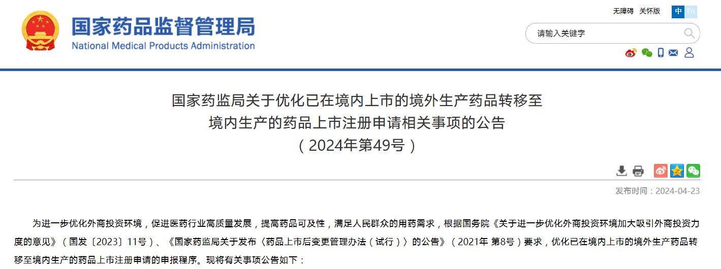 国家药监局关于优化已在境内上市的境外生产药品转移至境内生产的药品上市注册申请相关事项的公告(2024年第49号)