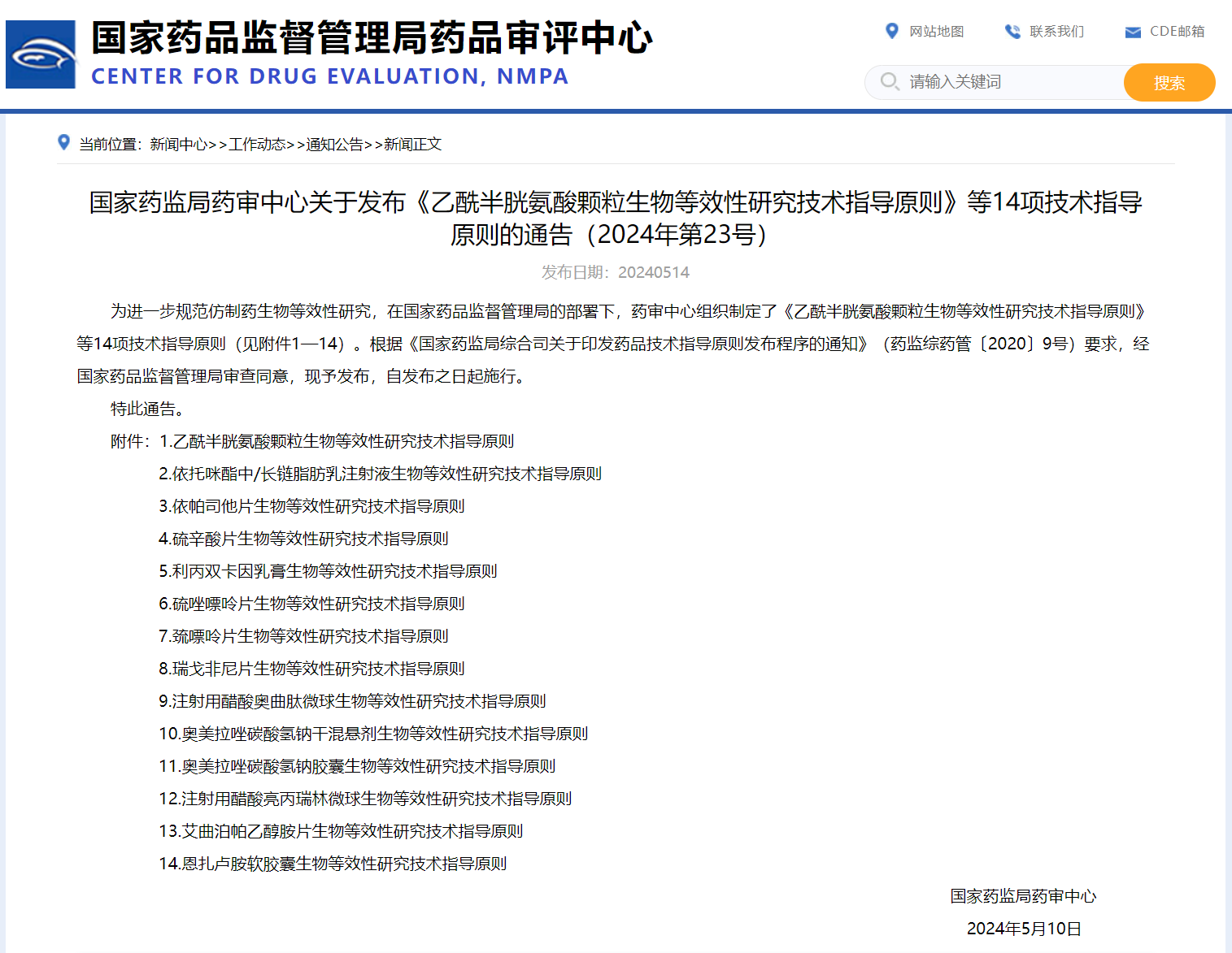 国家药监局药审中心关于发布《乙酰半胱氨酸颗粒生物等效性研究技术指导原则》等14项技术指导原则的通告(2024年第23号)
