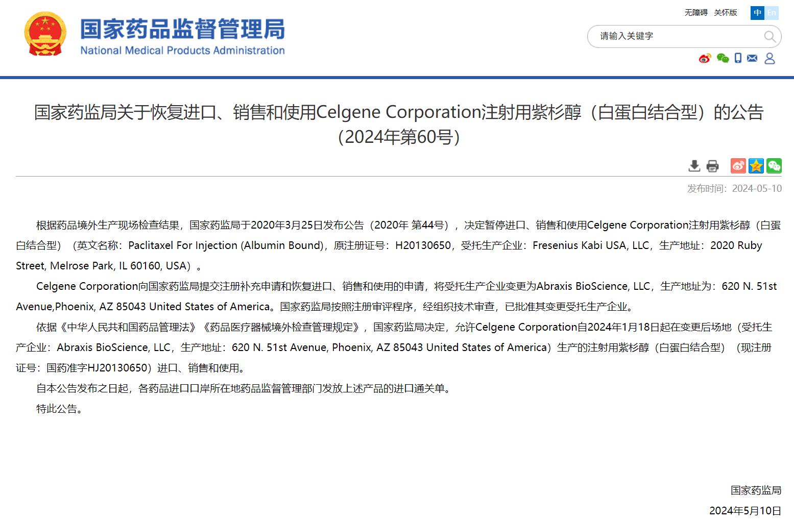 国家药监局关于恢复进口、销售和使用celgene corporation注射用紫杉醇(白蛋白结合型)的公告(2024年第60号)