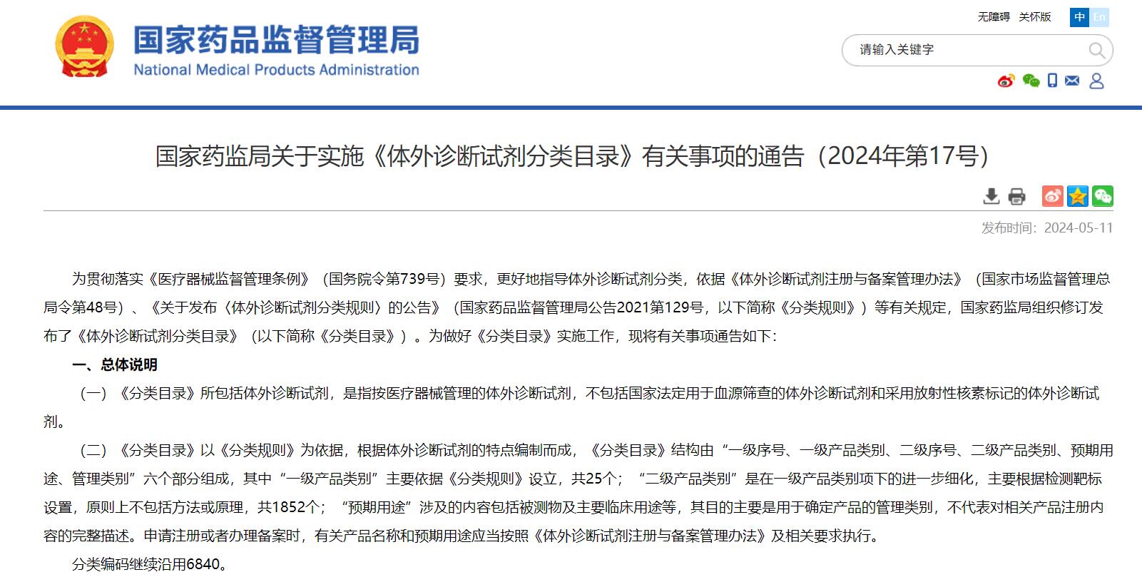 国家药监局关于实施《体外诊断试剂分类目录》有关事项的通告(2024年第17号)