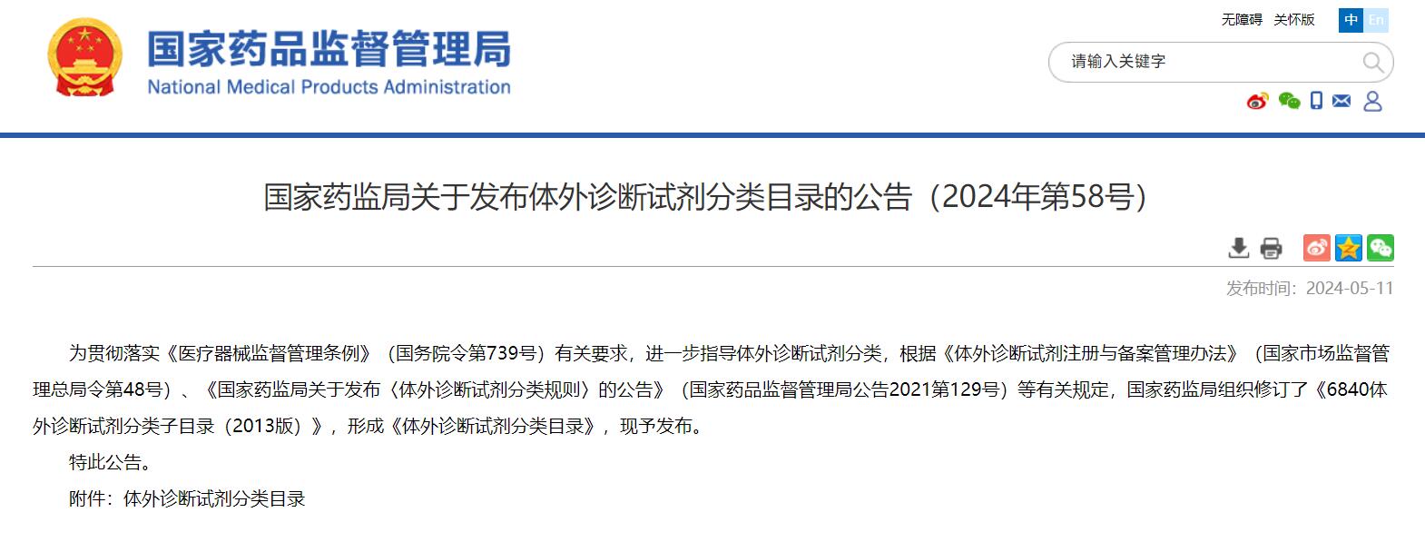 国家药监局关于发布体外诊断试剂分类目录的公告(2024年第58号)