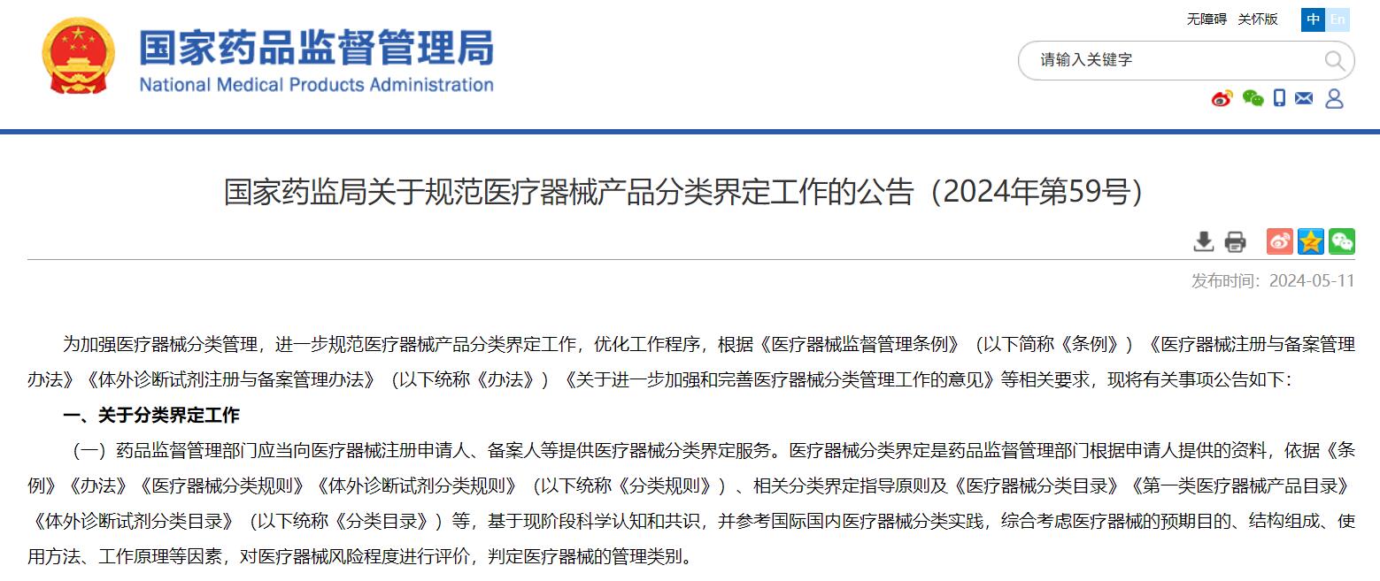 国家药监局关于规范医疗器械产品分类界定工作的公告(2024年第59号)