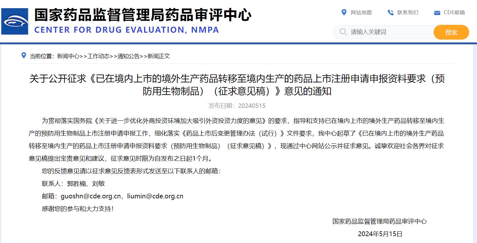 关于公开征求《已在境内上市的境外生产药品转移至境内生产的药品上市注册申请申报资料要求(预防用生物制品)(征求意见稿)》意见的通知