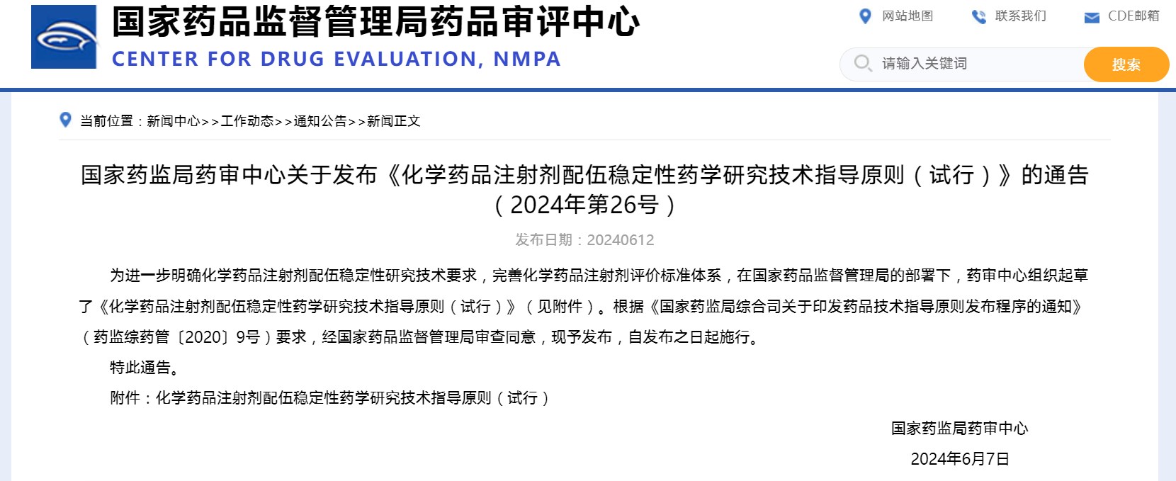 国家药监局药审中心关于发布《化学药品注射剂配伍稳定性药学研究技术指导原则(试行)》的通告(2024年第26号)