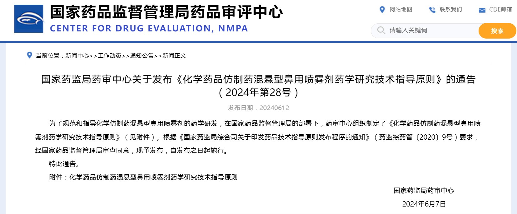 国家药监局药审中心关于发布《化学药品仿制药混悬型鼻用喷雾剂药学研究技术指导原则》的通告(2024年第28号)