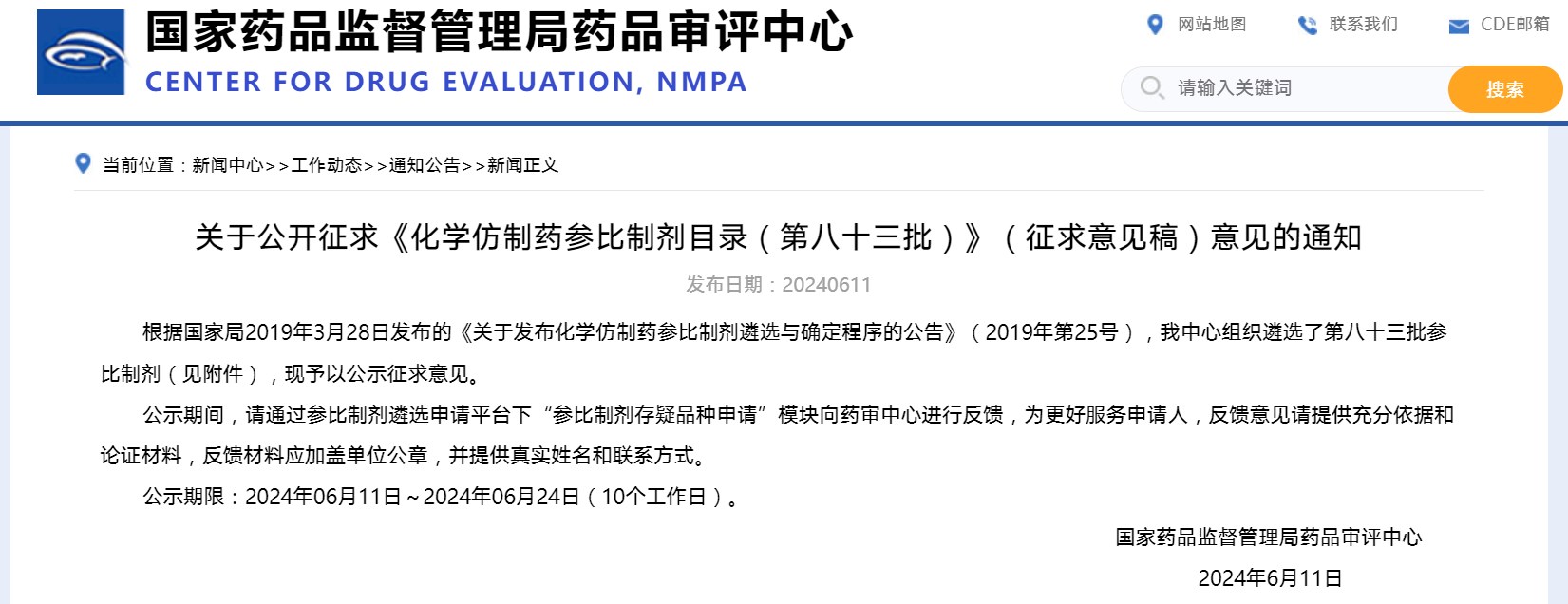 关于公开征求《化学仿制药参比制剂目录(第八十三批)》(征求意见稿)意见的通知