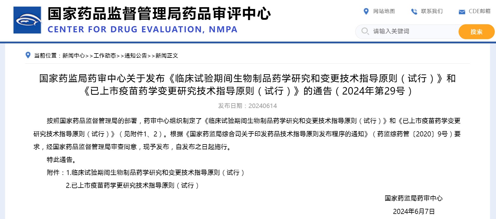 国家药监局药审中心关于发布《临床试验期间生物制品药学研究和变更技术指导原则(试行)》和《已上市疫苗药学变更研究技术指导原则(试行)》的通告(2024年第29号)