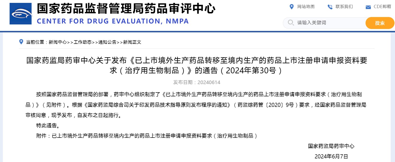 国家药监局药审中心关于发布《已上市境外生产药品转移至境内生产的药品上市注册申请申报资料要求(治疗用生物制品)》的通告(2024年第30号)