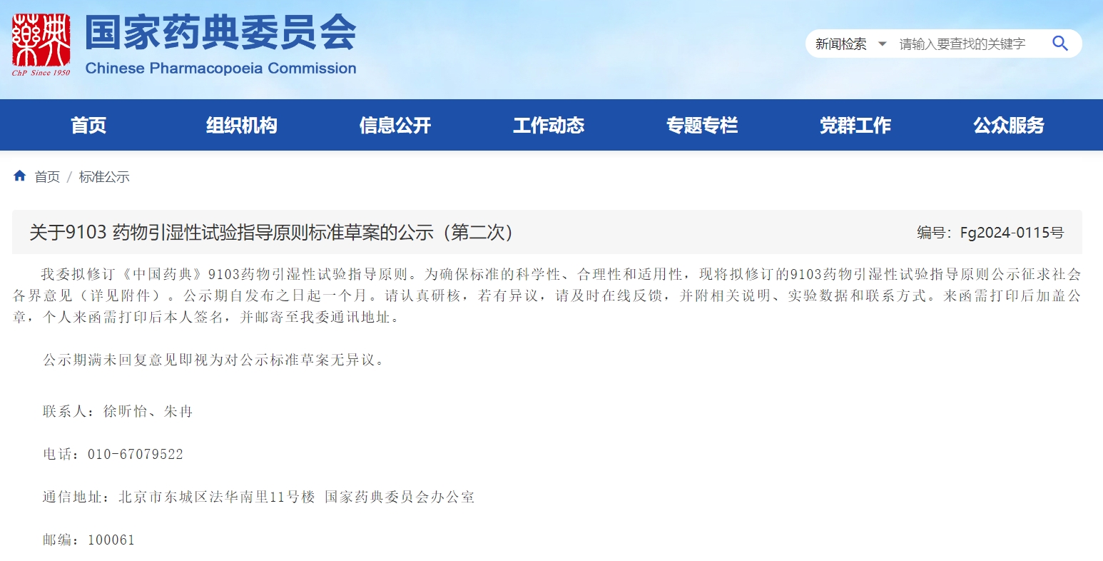 关于9103药物引湿性试验指导原则标准草案的公示(第二次)