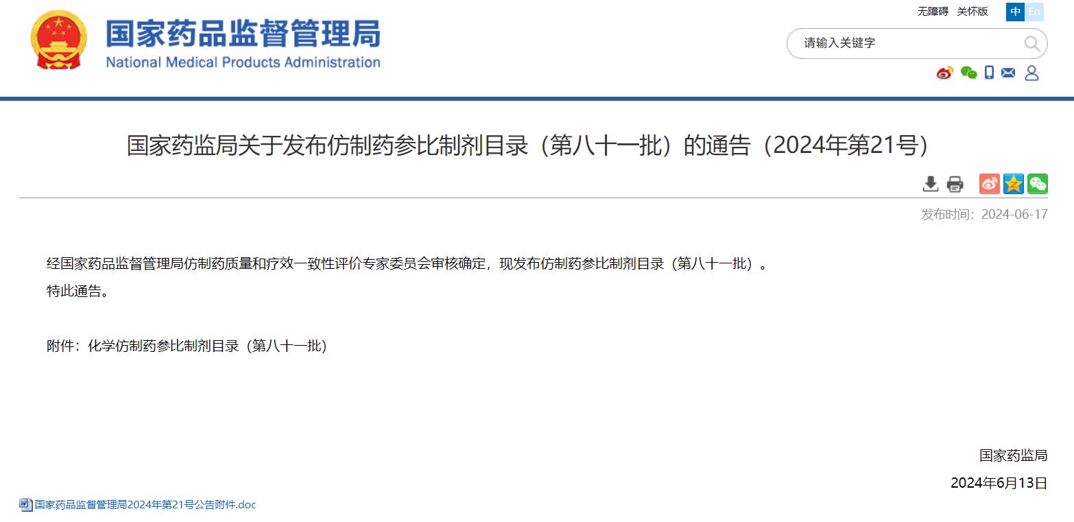 国家药监局关于发布仿制药参比制剂目录(第八十一批)的通告(2024年第21号)