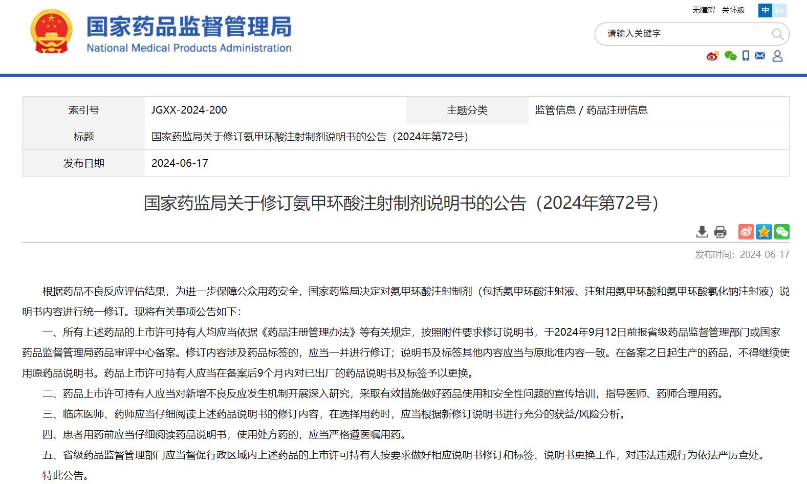 国家药监局关于修订氨甲环酸注射制剂说明书的公告(2024年第72号)