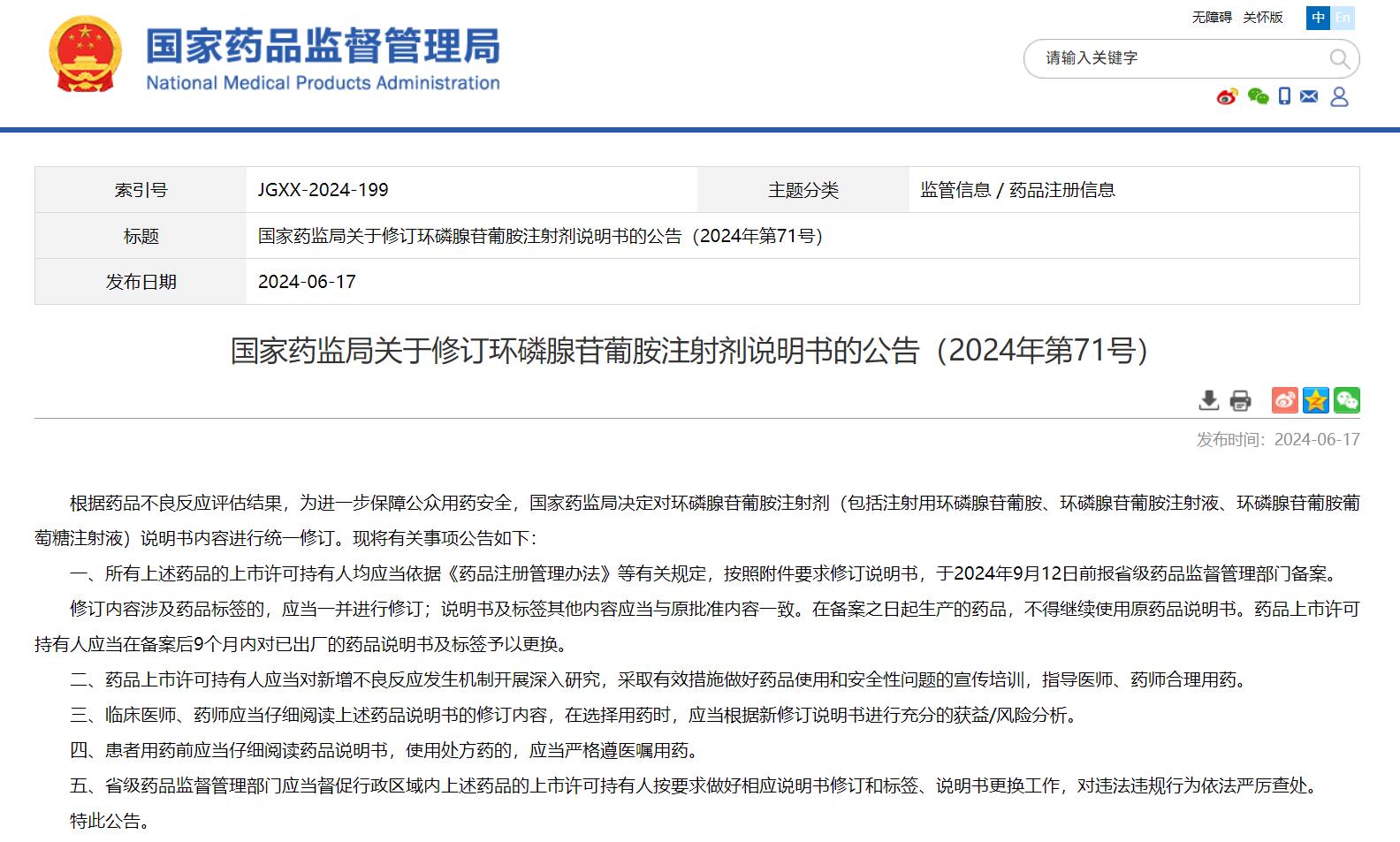 国家药监局关于修订环磷腺苷葡胺注射剂说明书的公告(2024年第71号)