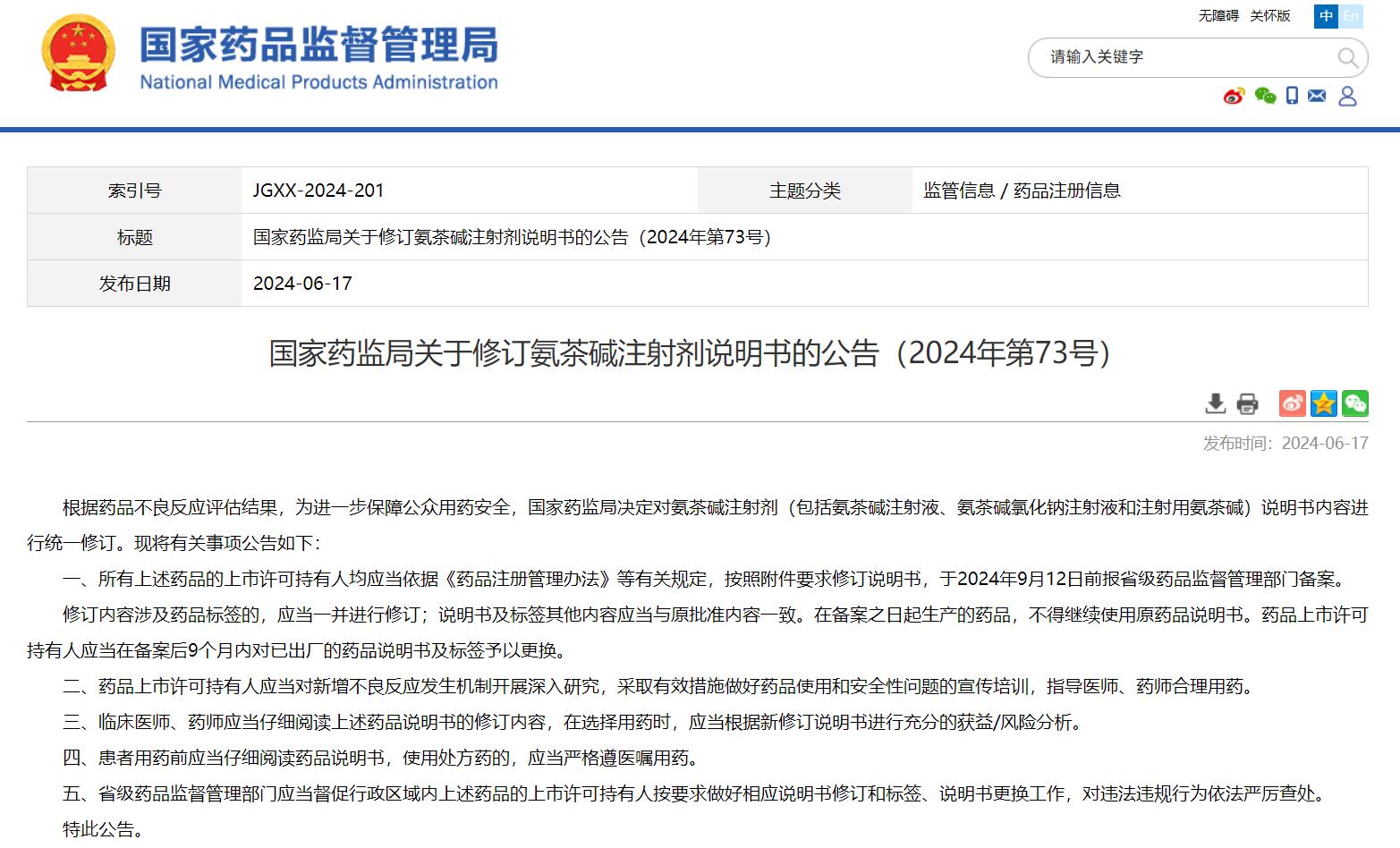 国家药监局关于修订氨茶碱注射剂说明书的公告(2024年第73号)