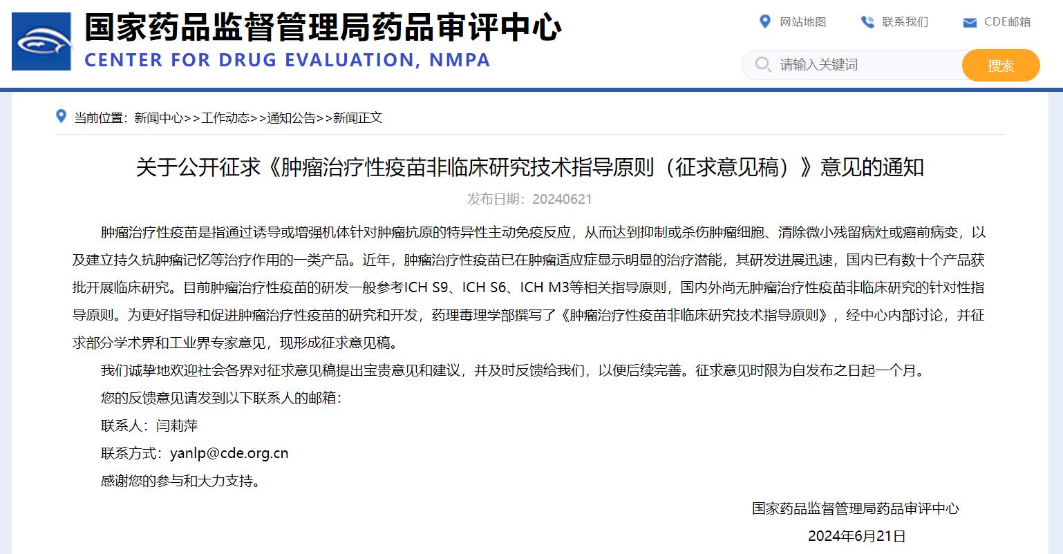 关于公开征求《肿瘤治疗性疫苗非临床研究技术指导原则(征求意见稿)》意见的通知