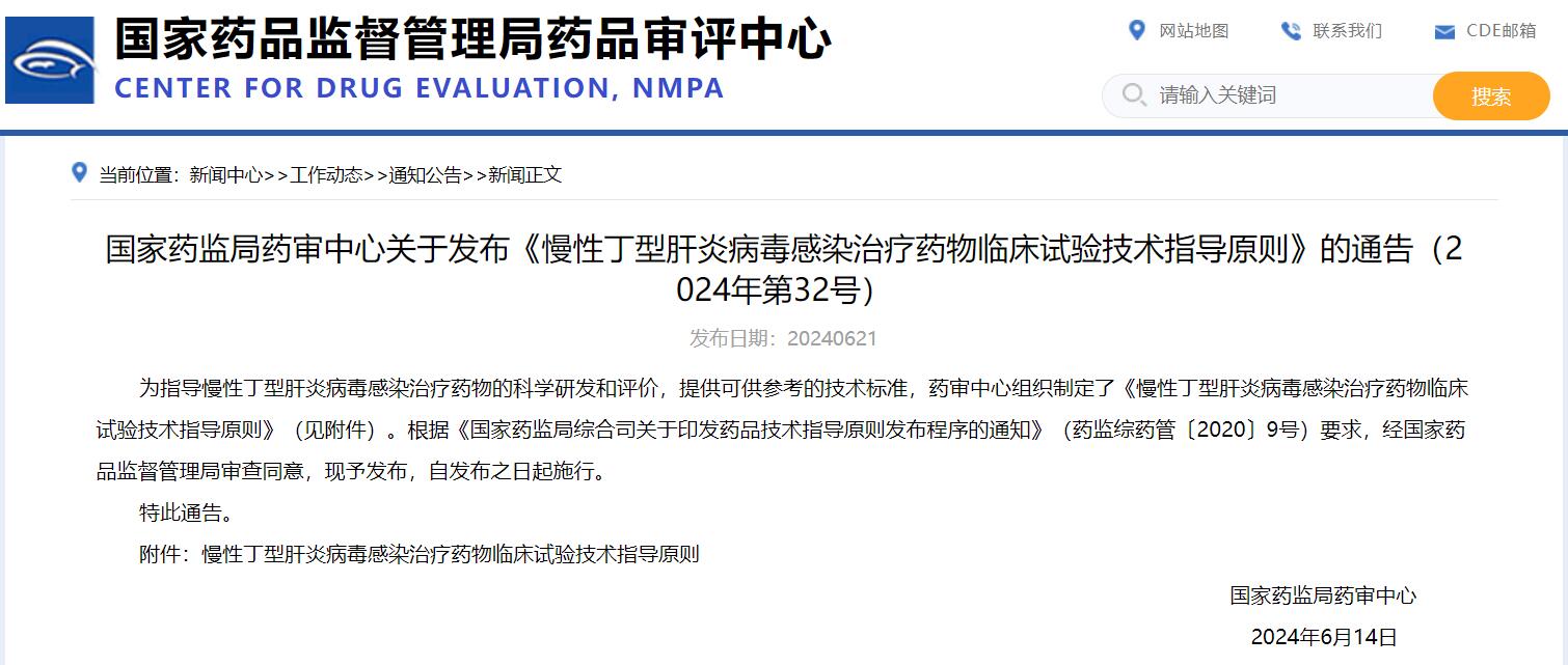 国家药监局药审中心关于发布《慢性丁型肝炎病毒感染治疗药物临床试验技术指导原则》的通告(2024年第32号)