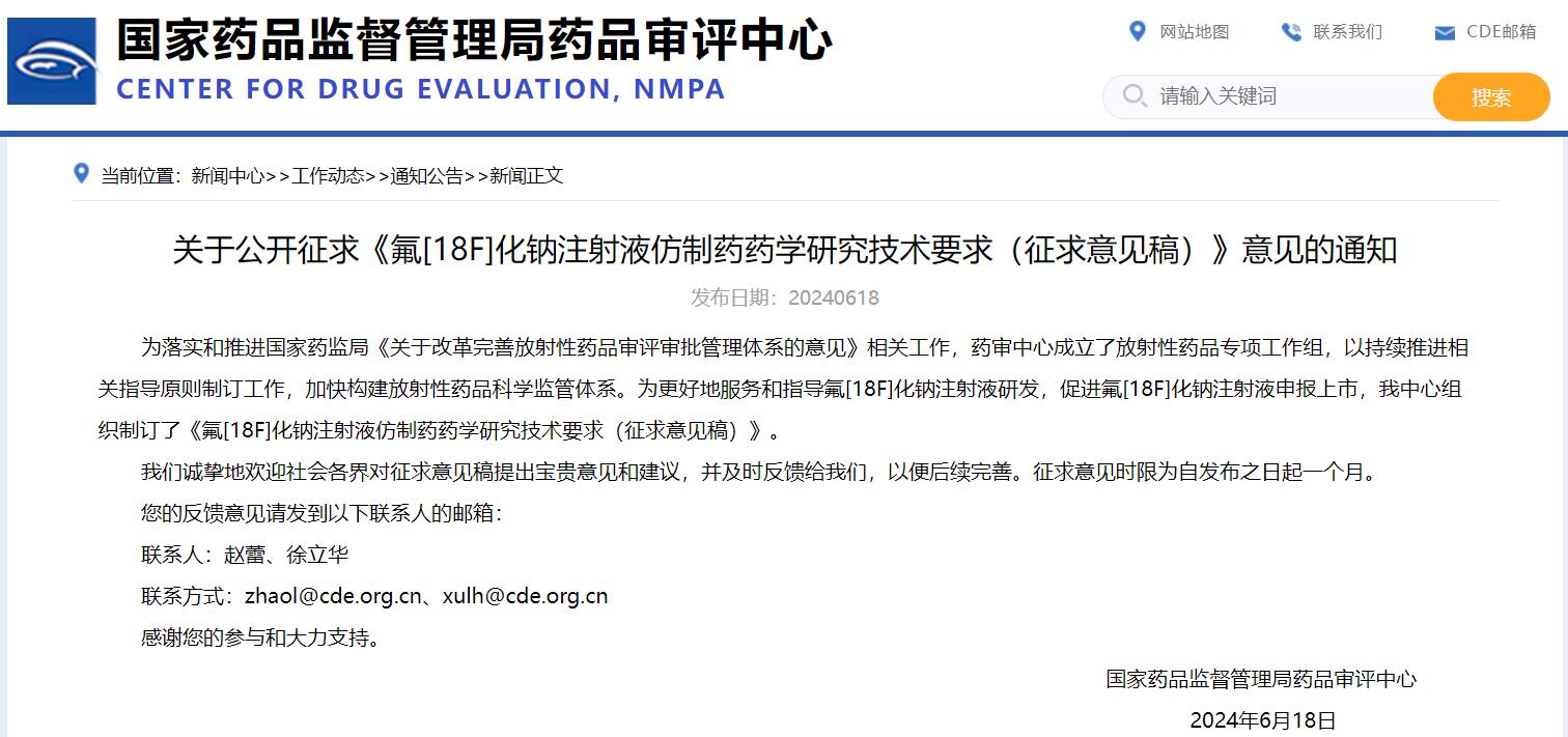 关于公开征求《氟[18f]化钠注射液仿制药药学研究技术要求(征求意见稿)》意见的通知