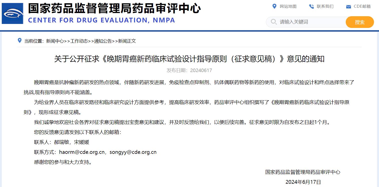 关于公开征求《晚期胃癌新药临床试验设计指导原则(征求意见稿)》意见的通知