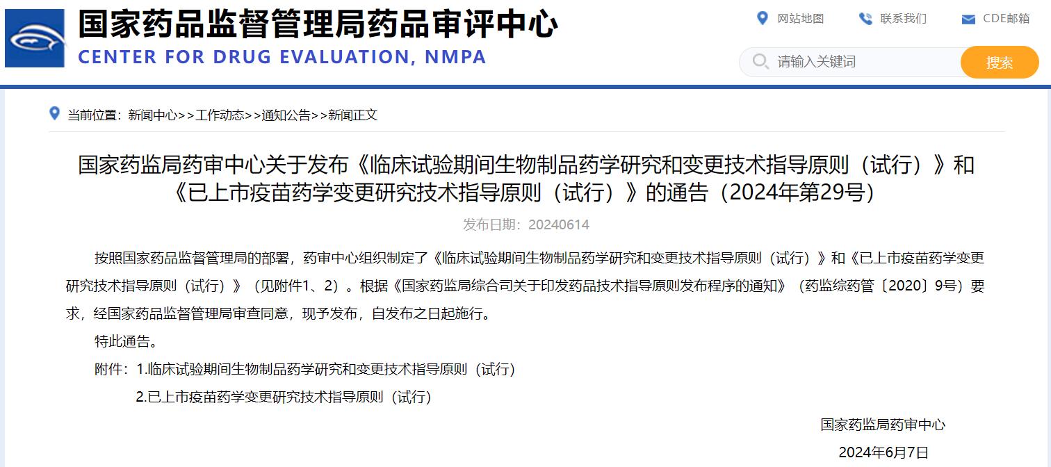 国家药监局药审中心关于发布《临床试验期间生物制品药学研究和变更技术指导原则(试行)》和《已上市疫苗药学变更研究技术指导原则(试行)》的通告(2024年第29号)