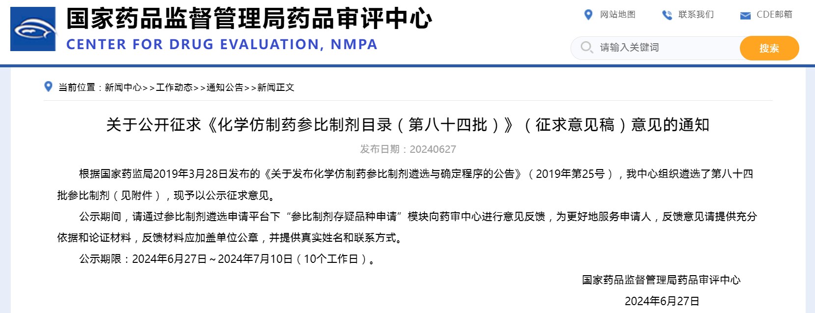 关于公开征求《化学仿制药参比制剂目录(第八十四批)》(征求意见稿)意见的通知