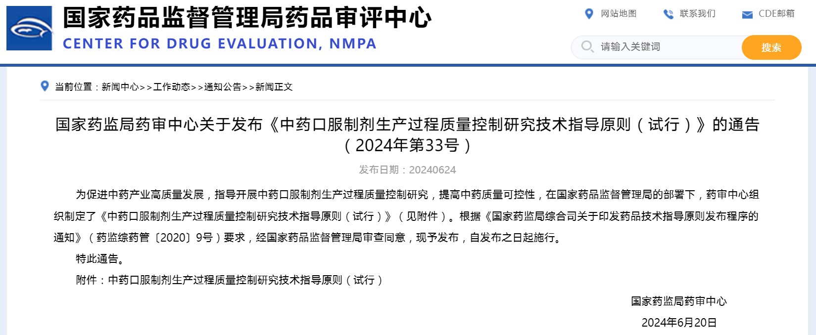 关于发布《中药口服制剂生产过程质量控制研究技术指导原则(试行)》的通告