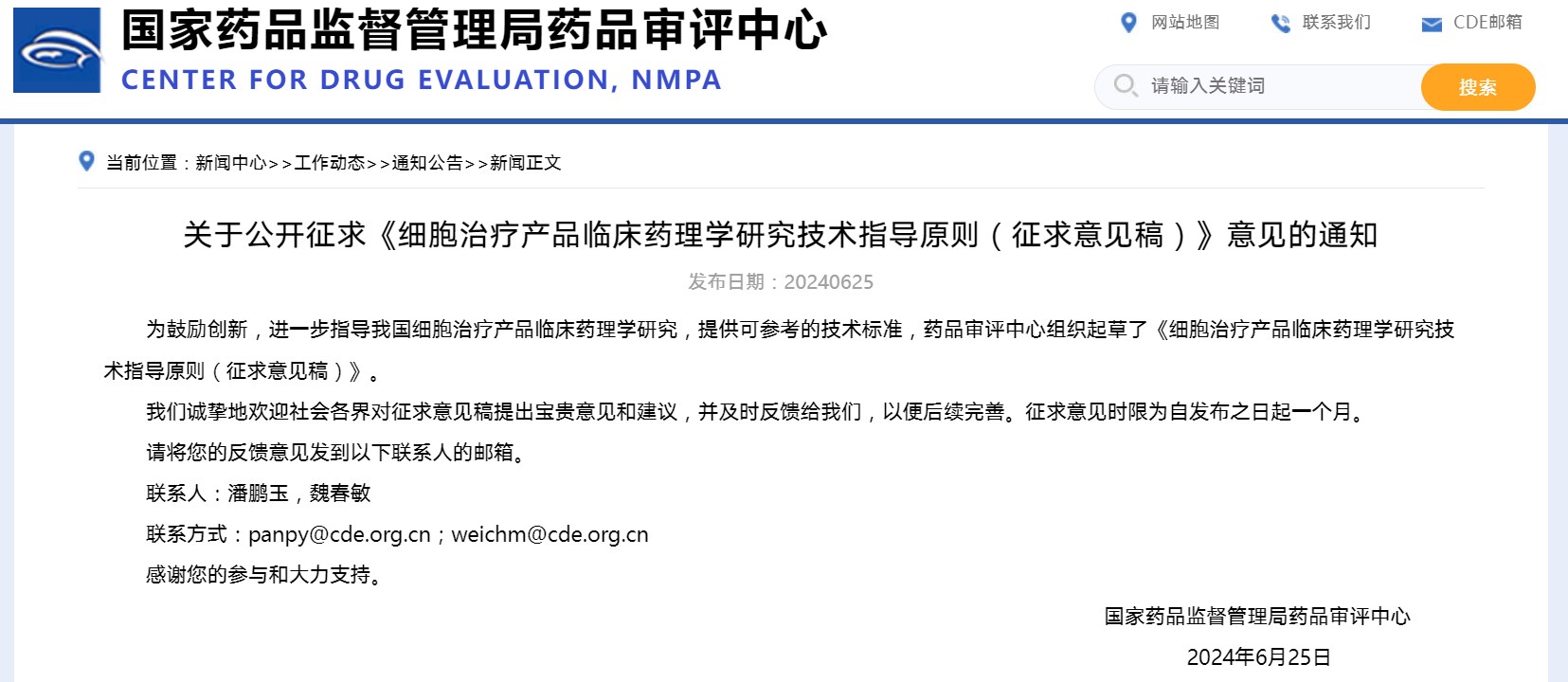 关于公开征求《细胞治疗产品临床药理学研究技术指导原则(征求意见稿)》意见的通知
