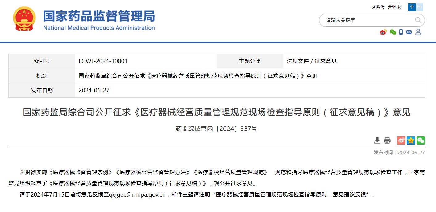 公开征求《医疗器械经营质量管理规范现场检查指导原则(征求意见稿)》意见