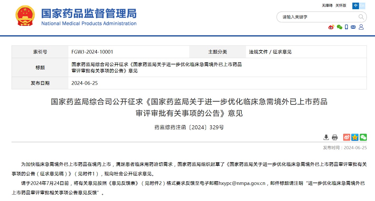 公开征求《国家药监局关于进一步优化临床急需境外已上市药品审评审批有关事项的公告》意见