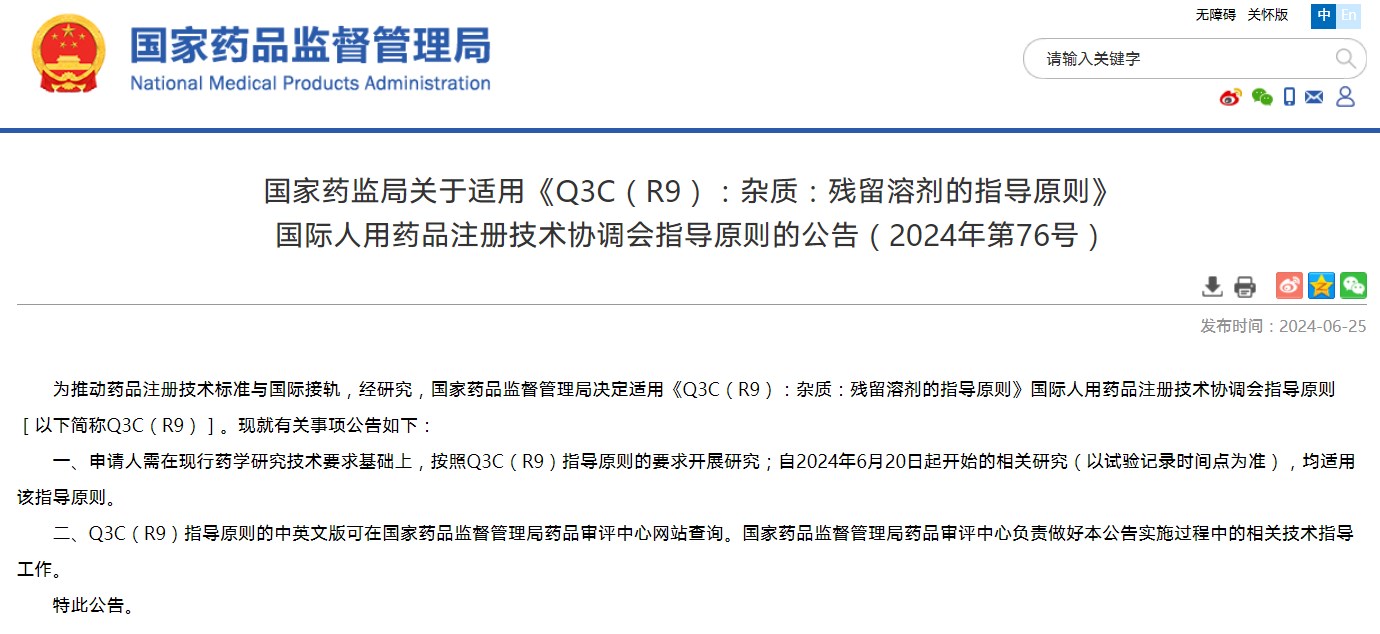 关于适用《q3c(r9):杂质:残留溶剂的指导原则》国际人用药品注册技术协调会指导原则的公告