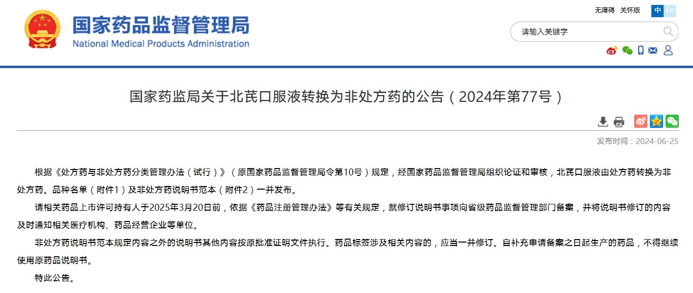 关于北芪口服液转换为非处方药的公告