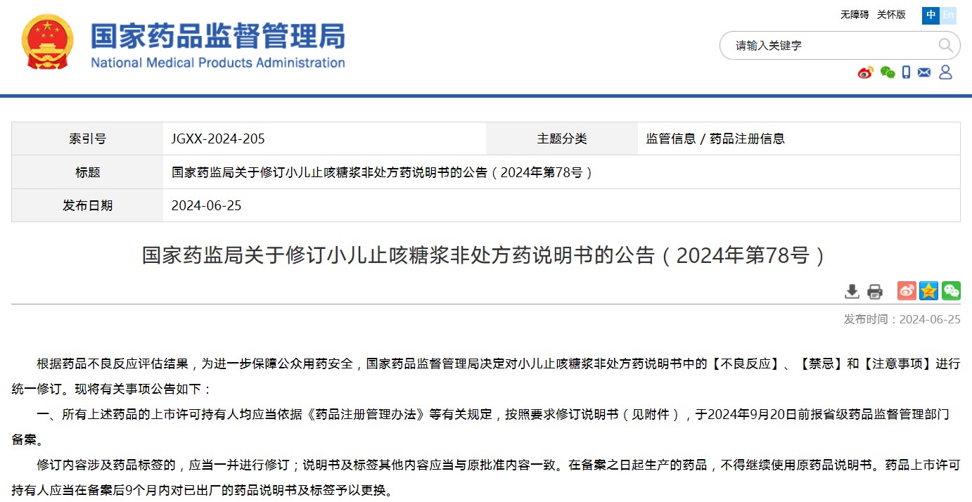 关于修订小儿止咳糖浆非处方药说明书的公告