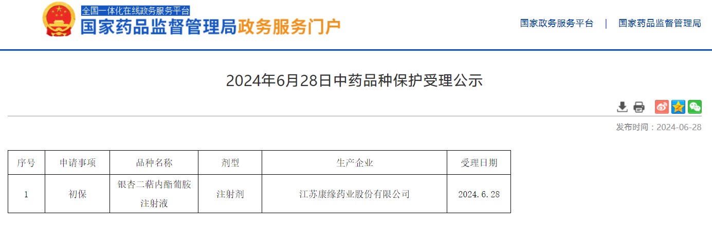 2024年6月28日中药品种保护受理公示