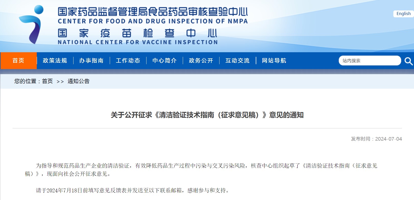 关于公开征求《清洁验证技术指南(征求意见稿)》意见的通知