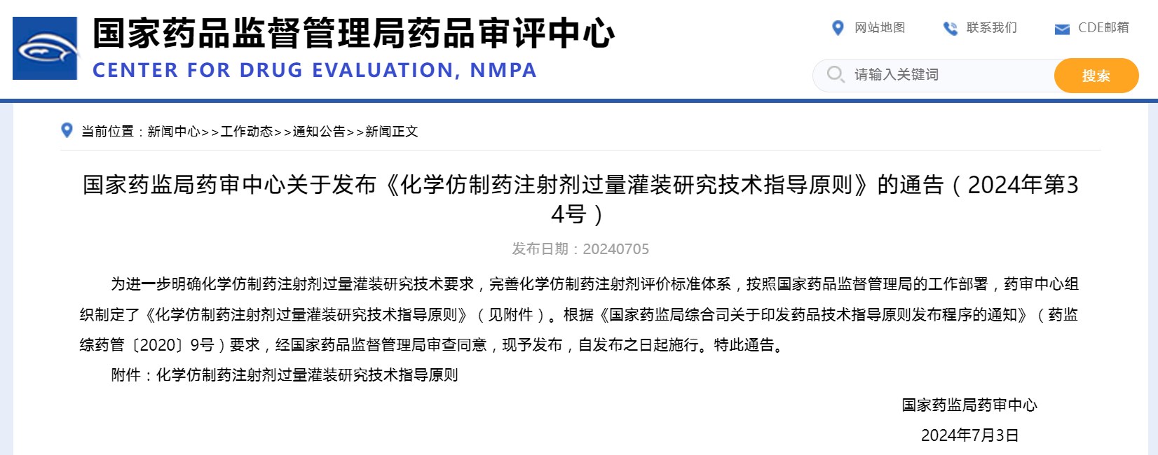 国家药监局药审中心关于发布《化学仿制药注射剂过量灌装研究技术指导原则》的通告(2024年第34号)