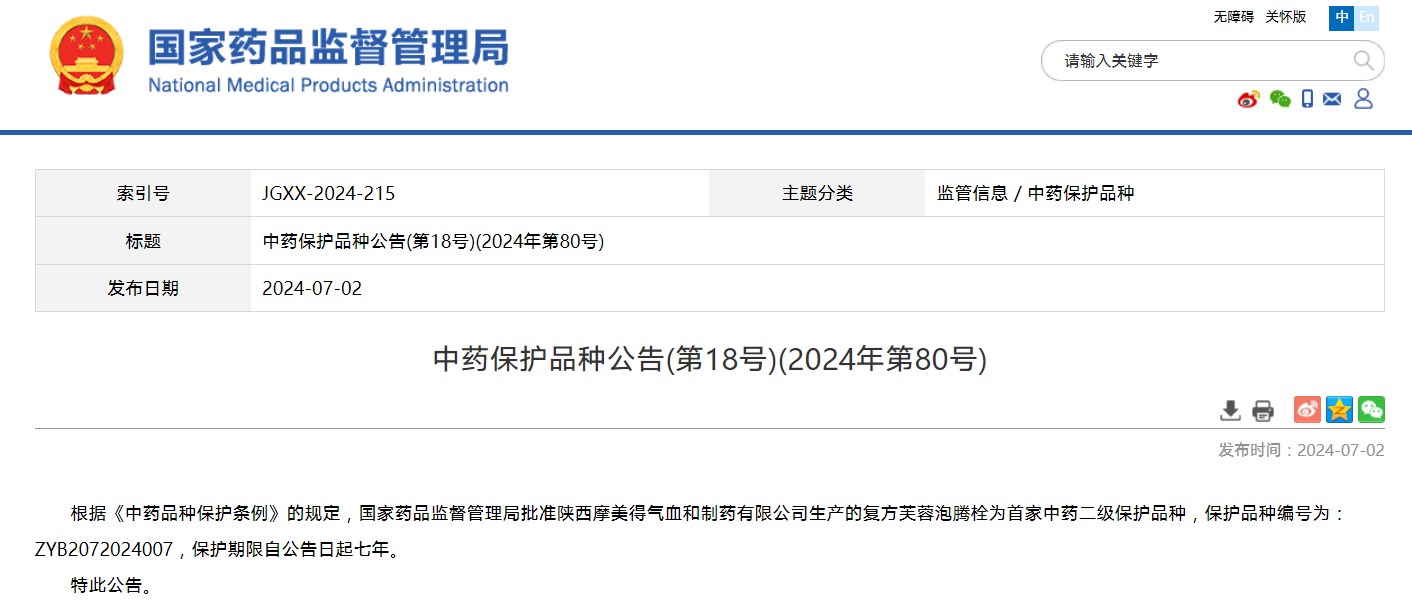 中药保护品种公告(第18号)(2024年第80号)