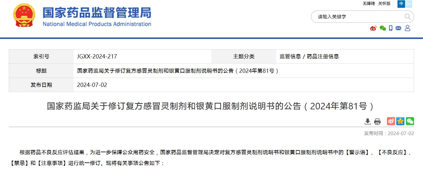 国家药监局关于修订复方感冒灵制剂和银黄口服制剂说明书的公告(2024年第81号)