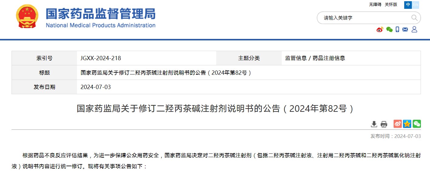 国家药监局关于修订二羟丙茶碱注射剂说明书的公告(2024年第82号)