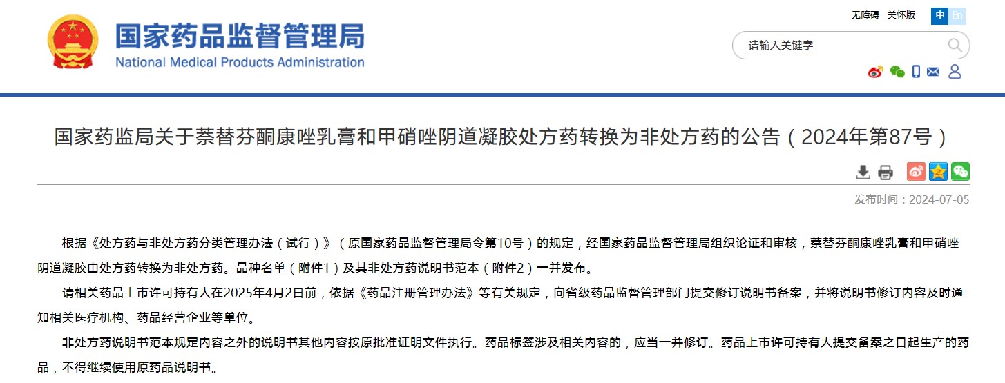国家药监局关于萘替芬酮康唑乳膏和甲硝唑阴道凝胶处方药转换为非处方药的公告(2024年第87号)