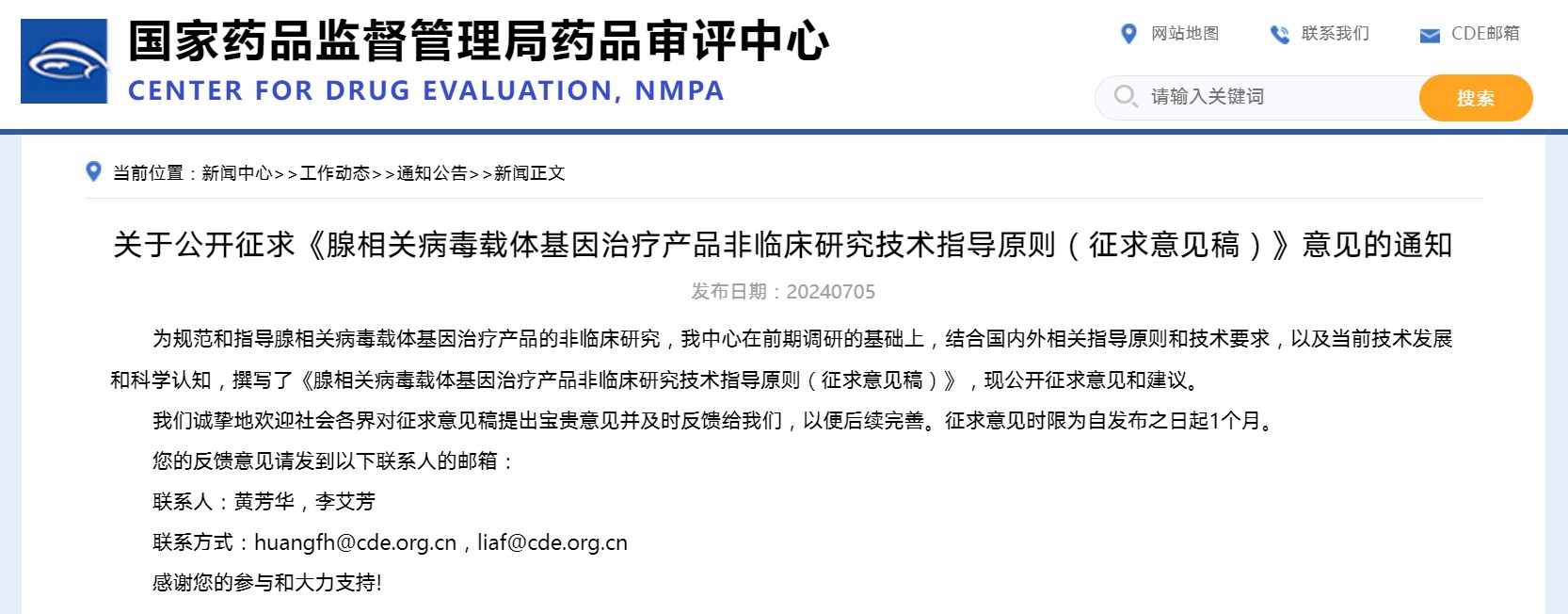 关于公开征求《腺相关病毒载体基因治疗产品非临床研究技术指导原则(征求意见稿)》意见的通知