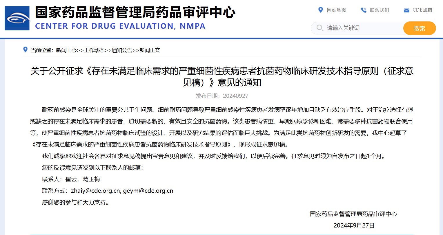 关于公开征求《存在未满足临床需求的严重细菌性疾病患者抗菌药物临床研发技术指导原则(征求意见稿)》意见的通知