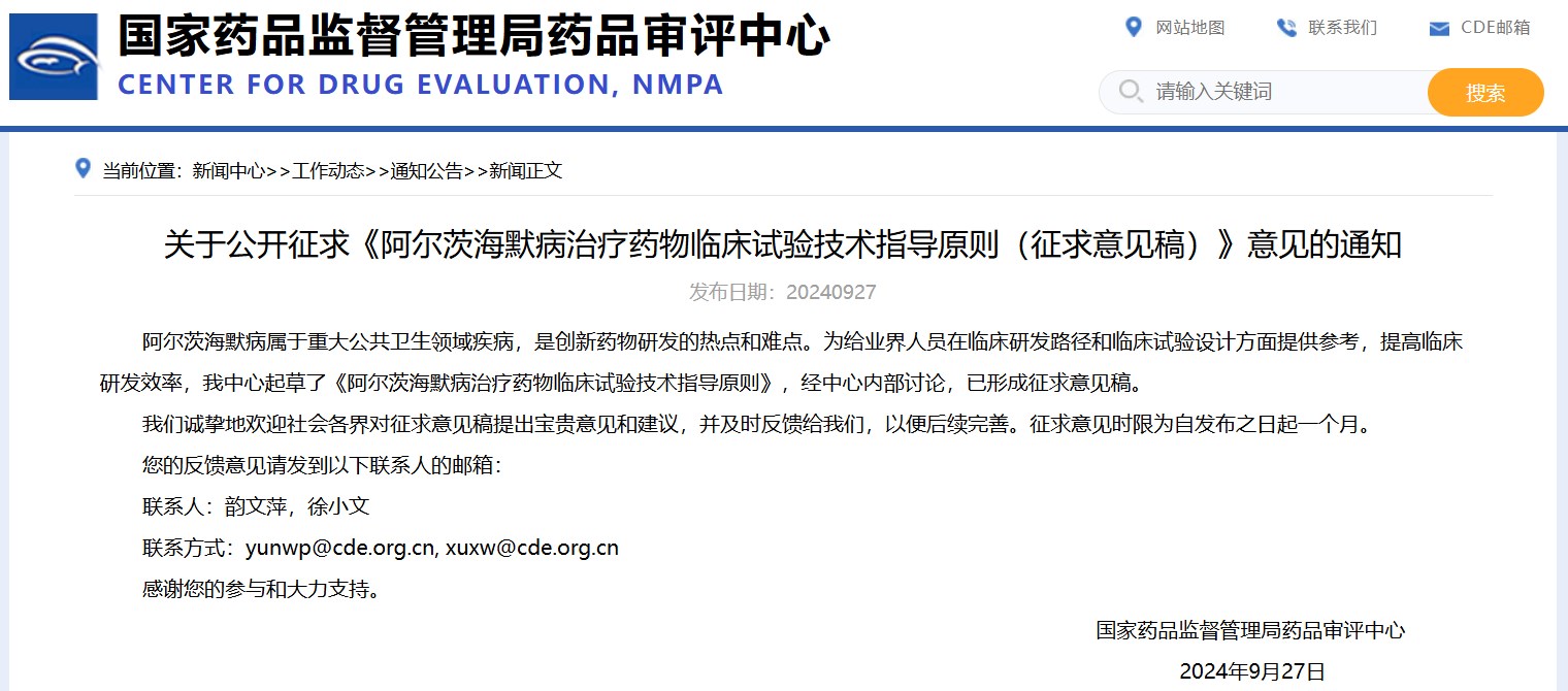 关于公开征求《阿尔茨海默病治疗药物临床试验技术指导原则(征求意见稿)》意见的通知