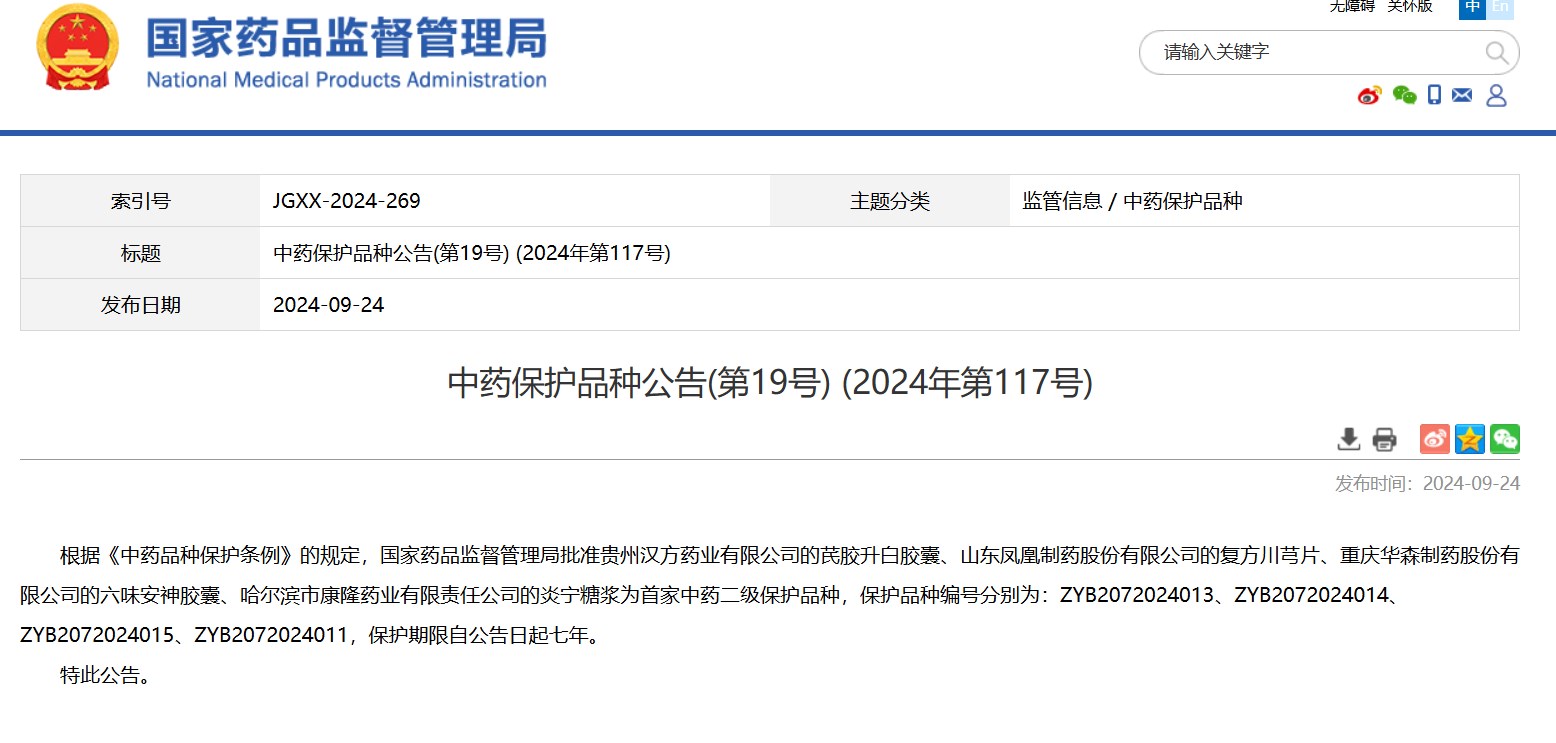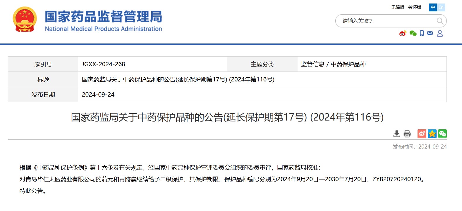 国家药监局关于中药保护品种的公告(延长保护期第17号) (2024年第116号)
