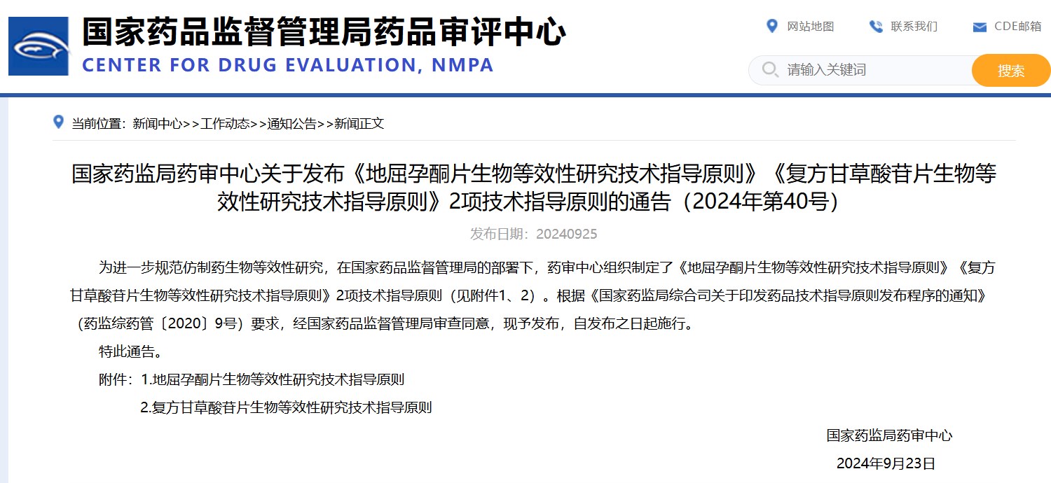 国家药监局药审中心关于发布《地屈孕酮片生物等效性研究技术指导原则》《复方甘草酸苷片生物等效性研究技术指导原则》2项技术指导原则的通告(2024年第40号)