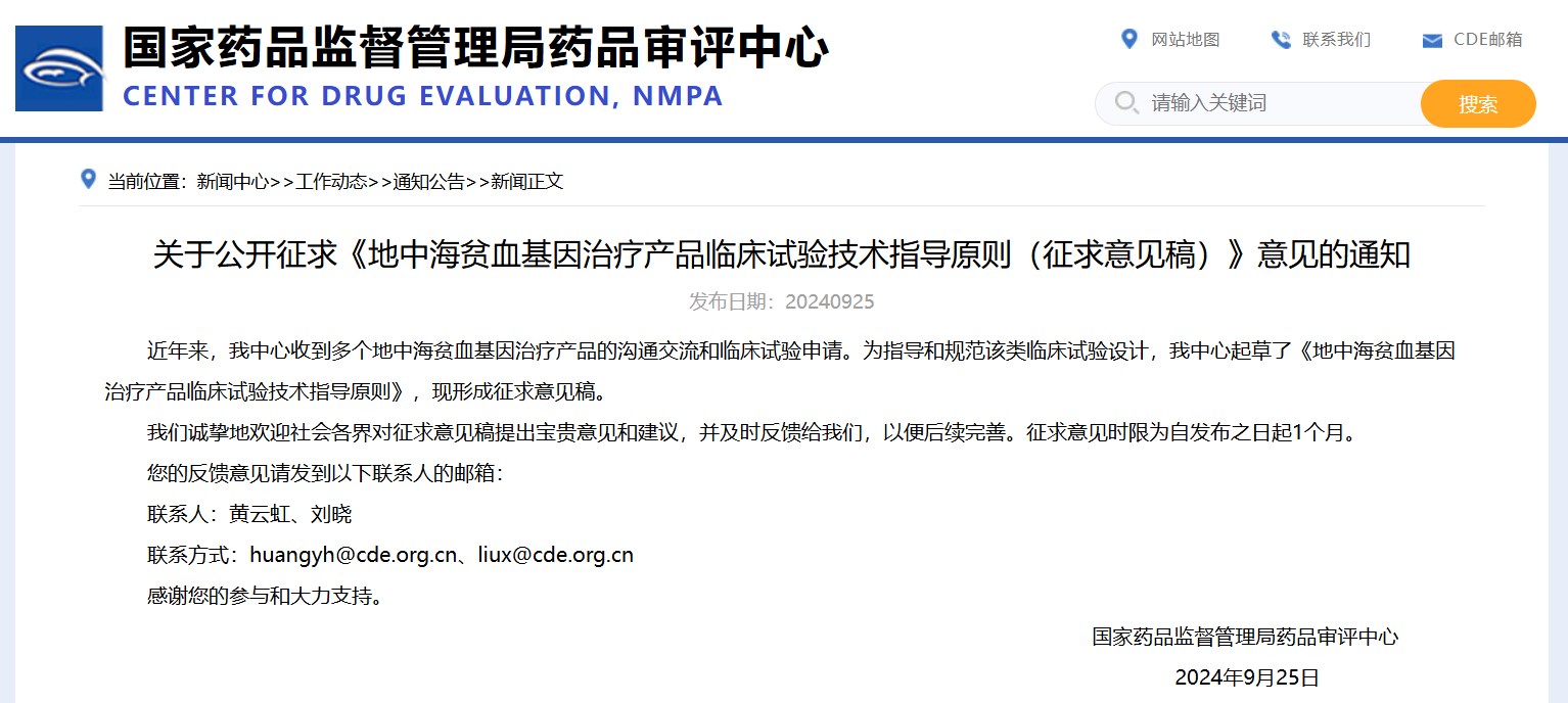 关于公开征求《地中海贫血基因治疗产品临床试验技术指导原则(征求意见稿)》意见的通知