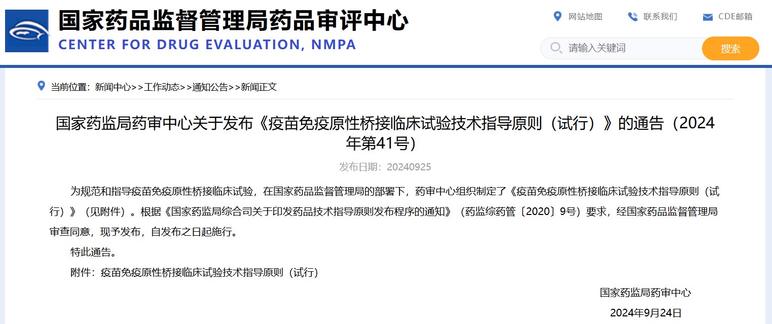 国家药监局药审中心关于发布《疫苗免疫原性桥接临床试验技术指导原则(试行)》的通告(2024年第41号)